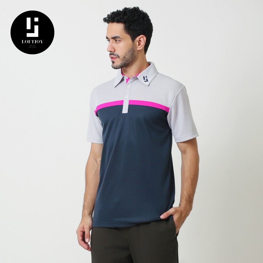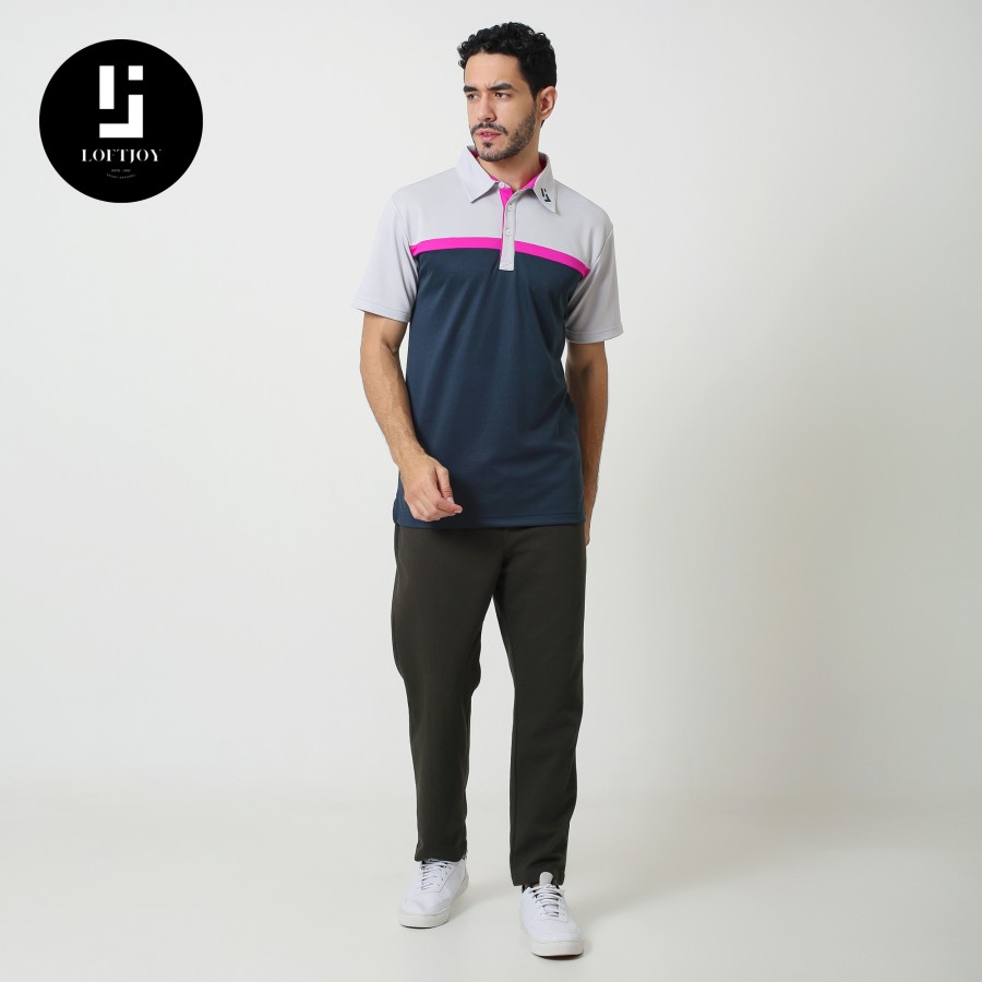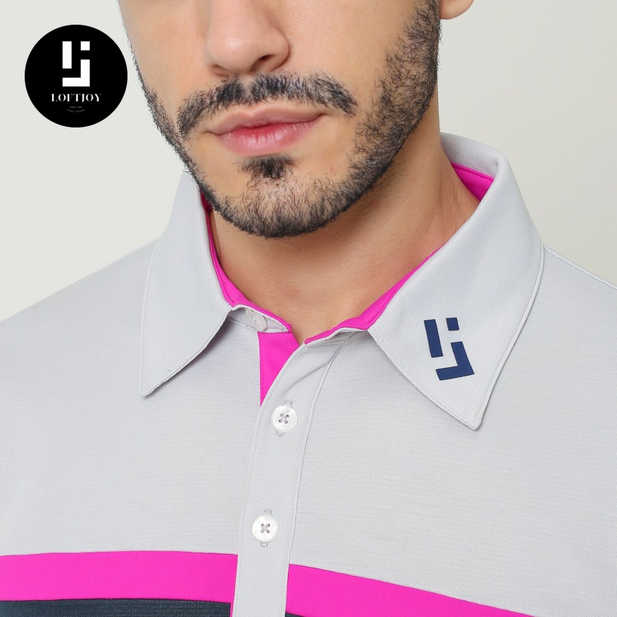 • Color Scheme: This polo shirt features a color block design with a dark navy blue bottom, gray top, and a bold pink horizontal stripe across the chest. The collar and button placket also combine pink and gray, adding a stylish touch.